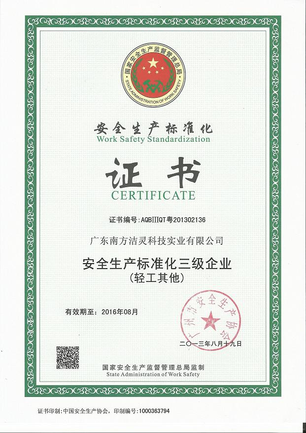 2013年8月19日,广东南方洁灵科技实业有限公司被广州市安全生产协会评为“国家安全生产标准化三级企业”,并授予由国家安全生产监督管理总局监制的荣誉证书。